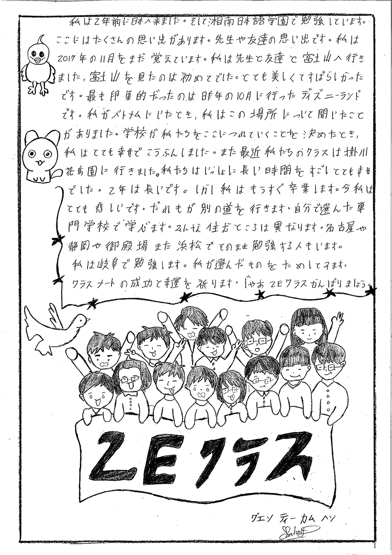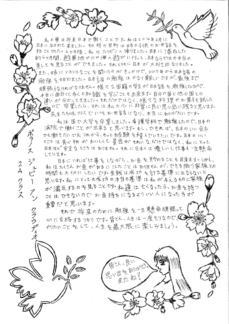 - 先生たちがいつも全力で授業を教えてくださったことや友達と楽しんで過ごした時間は、決して忘れられないものです。学校が色々なことを助けてくれたことへの感謝は言葉では表せません。私が今、日本で簡単に生活ができるようになったのはすべて先生たちのおかげです。